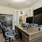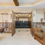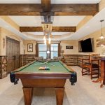 Primary with ensuite-dual sinks, sep shower & a garden tub! Staircase with wrought iron spindles lead to the Ultimate one-of-a-kind game room featuring faux wood beam ceiling, dart board feature, custom stucco/brick finished walls, custom wood doors leading to the tiered media room with 6 electric reclining chairs & 5.1 Home Theater System & Projector & 120 inch white screen!