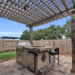 Step outside and be captivated by the vibrant green sports astroturf that covers the entire backyard. This low-maintenance and durable feature make it perfect for any outdoor activities without the hassle of maintaining a natural lawn. As you relax under the shade of the Cypress pergola, with an outdoor kitchen at your disposal, you will never want to leave this backyard oasis.